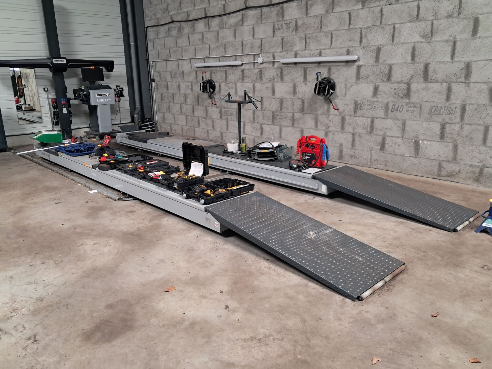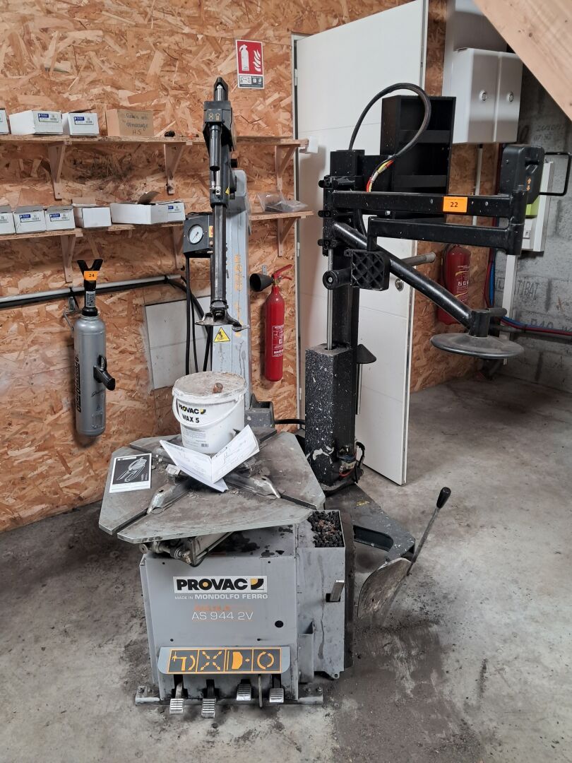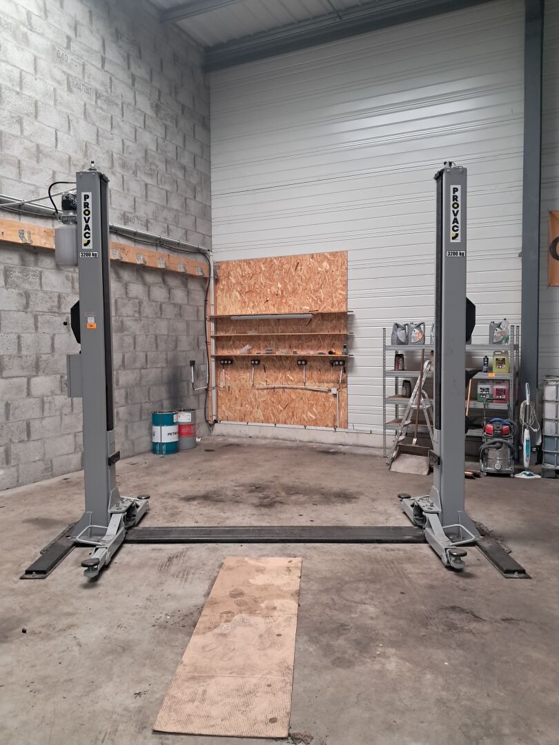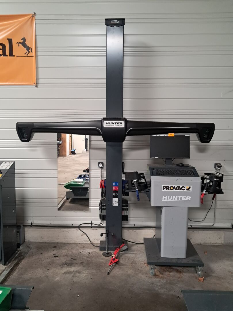Banc de géométrie HUNTER PROVAC*, Pont Ciseaux OMER* et 2 colonnes PROVAC*, Compresseur et Démonte pneu PROVAC*, Equilibreuse HUNTER*, Diag GUTMANN*, Outillage…